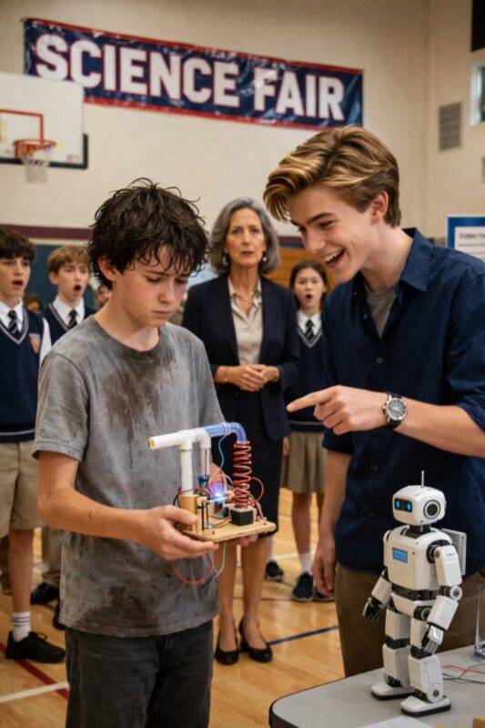 Next to him stood the richest boy in the class — the billionaire’s son. He was presenting an expensive robot, shining with the latest technology.